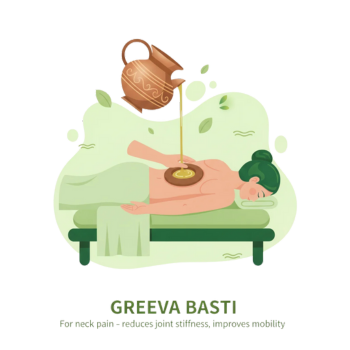 Warm medicated oil is held over the neck region to relax cervical muscles and ease tension.